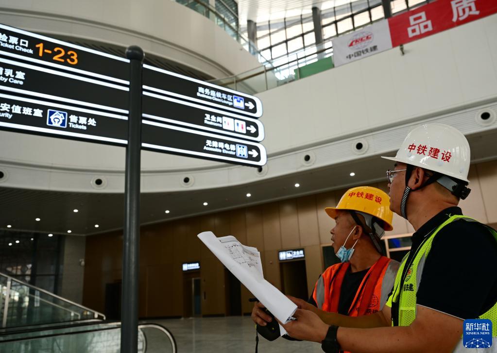 6月19日,施工方在即將竣工的福廈高鐵新建廈門北站候車大廳里排查設施安裝。