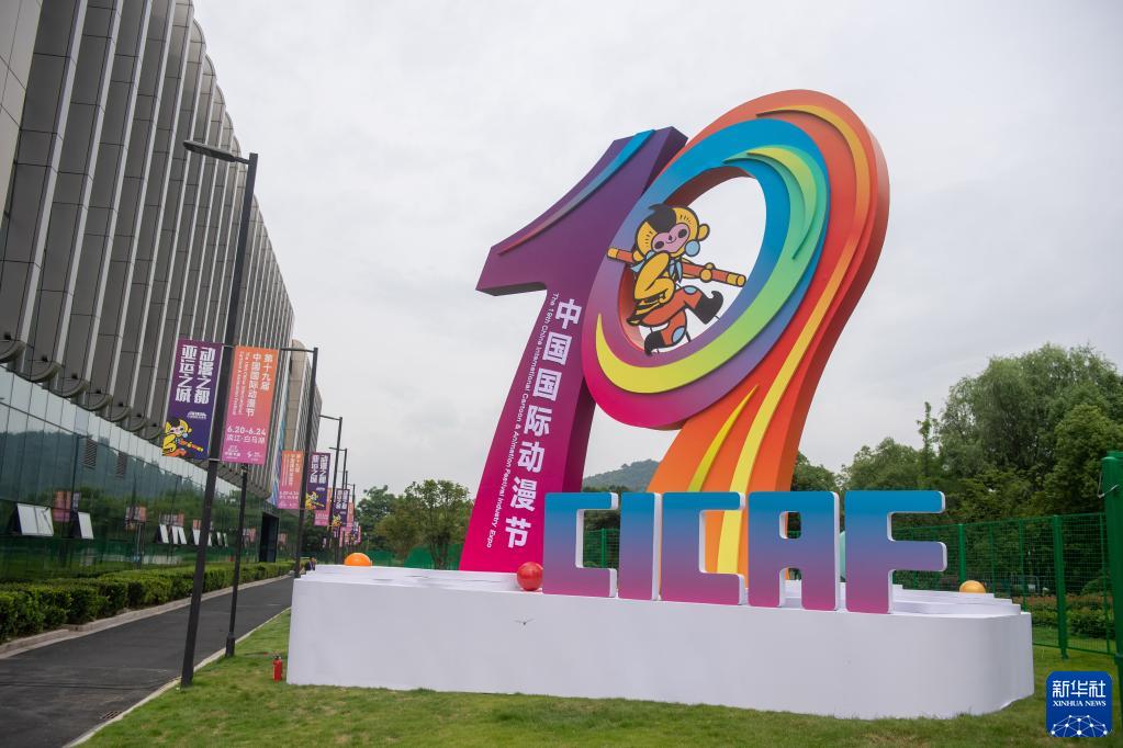 在第十九屆中國國際動漫節主會場杭州白馬湖國際會展中心旁豎立的主題雕塑(6月20日攝)。