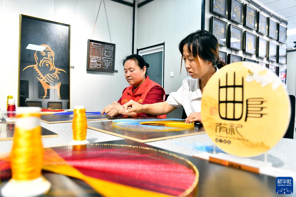 在曲阜市尼山腳下的魯源新村文化街區,工作人員在制作弦絲畫(2023年6月8日攝)。