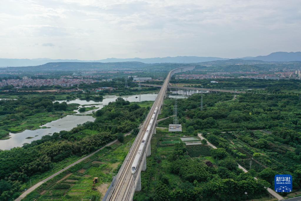列車在杭臺高鐵位于浙江嵊州境內的路段行駛(6月19日攝,無人機照片)。