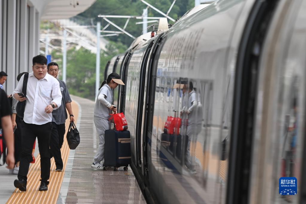 旅客在浙江嵊州新昌站登車(6月19日攝)。