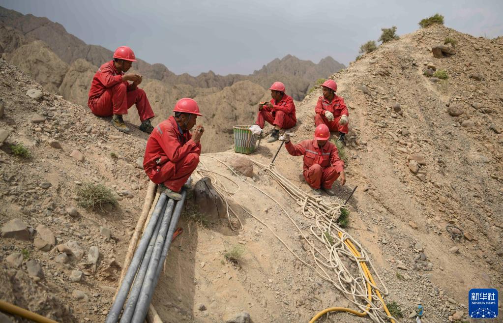 耗時約3個小時將全部鉆井設備搬過一處崖壁后,東方物探公司塔里木物探處2170隊的工人坐在崖壁上休息(6月18日攝)。新華社記者 胡虎虎 攝