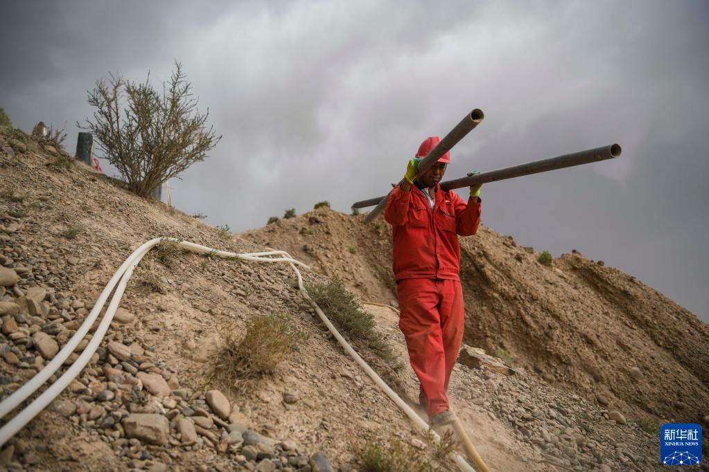 東方物探公司塔里木物探處2170隊的鉆工陳新志扛著鉆桿快步走在山坡上,趕往下一個鉆井點位(6月18日攝)。新華社記者 胡虎虎 攝