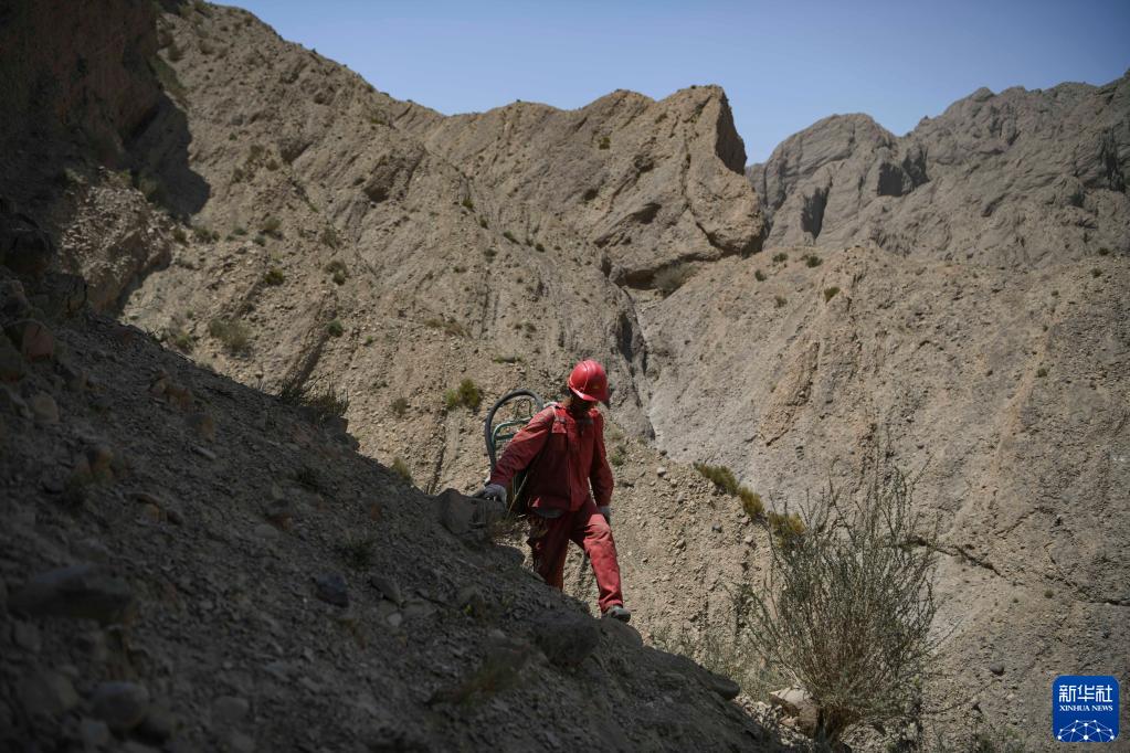 東方物探公司塔里木物探處2170隊的鉆工張堂紅背著鉆井設備翻越山坡,前往下一個鉆井點位(6月18日攝)。新華社記者 胡虎虎 攝