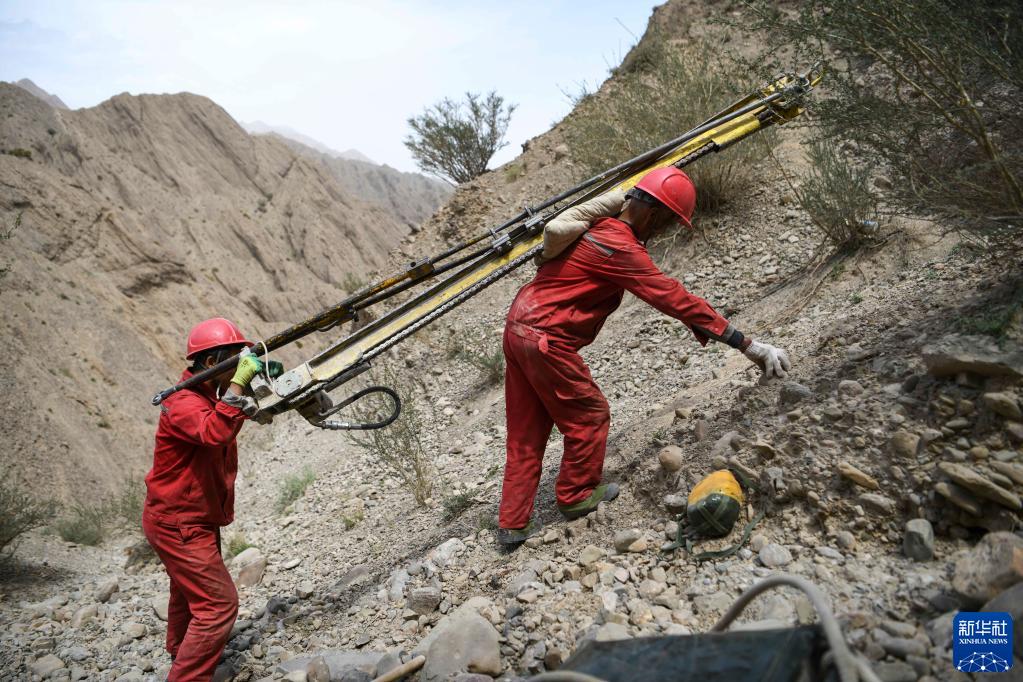 東方物探公司塔里木物探處2170隊59歲的鉆工馬維海(前)和工友扛著鉆井設備爬陡坡(6月18日攝)。新華社記者 胡虎虎 攝
