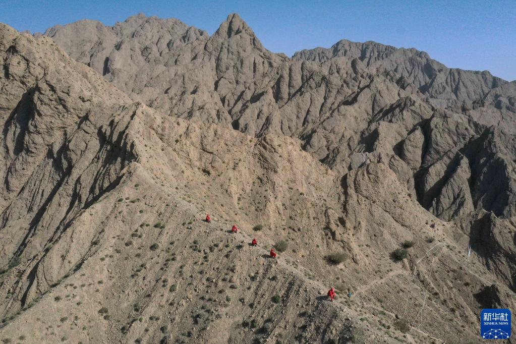 東方物探公司塔里木物探處2170隊鉆井組的工人在山間休息(6月18日攝,無人機照片)。新華社記者 胡虎虎 攝