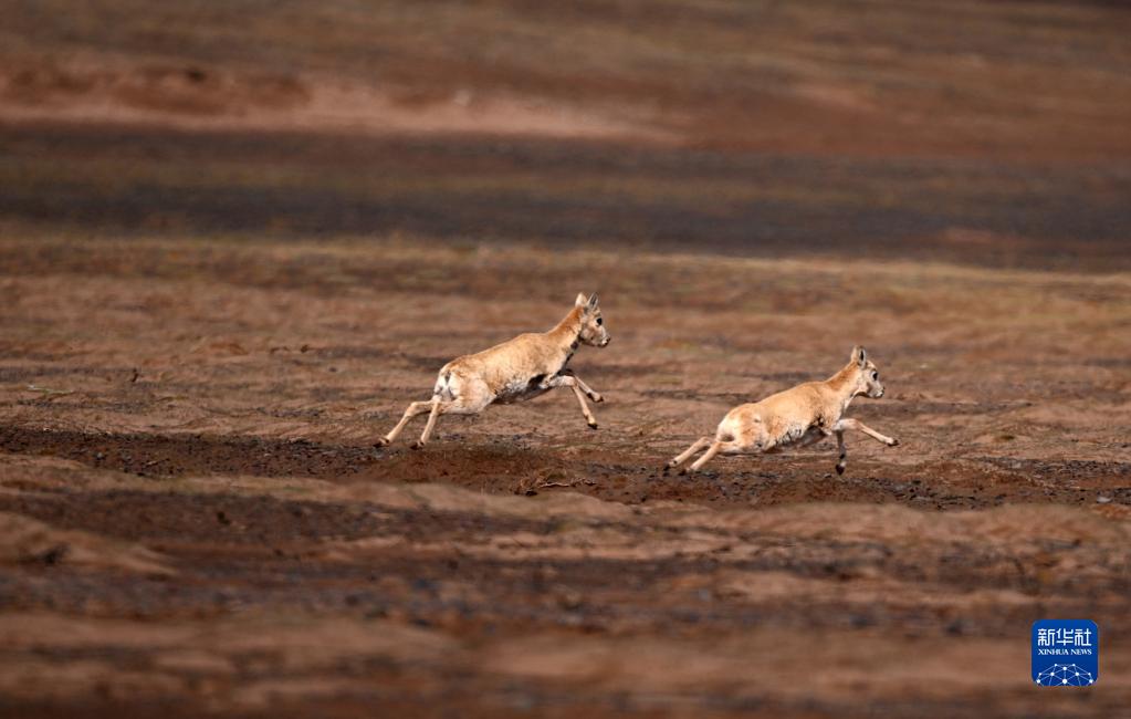 兩只藏羚羊在可可西里卓乃湖區域活動(6月17日攝)。