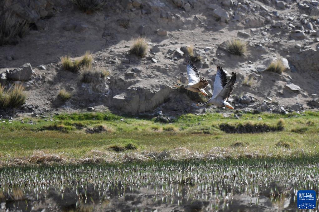 兩只斑頭雁在鹽池灣濕地飛翔(6月20日攝)。