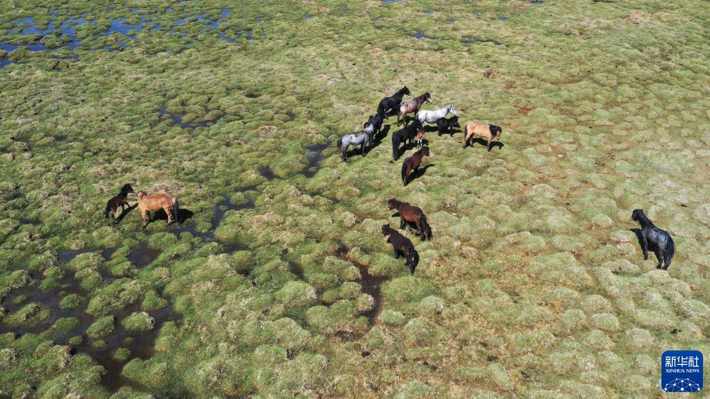 馬群在鹽池灣濕地休憩(6月20日攝,無人機照片)。
