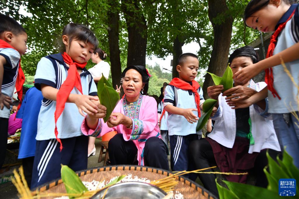 6月20日,在廣西融水苗族自治縣桿洞鄉黨鳩村,小學生向村里的婦女學習包粽子。
