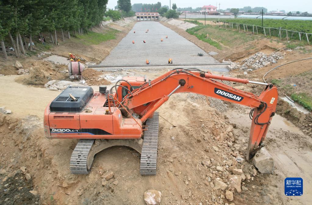 6月20日,工人在河北省盧龍縣木井鎮境內的龍鳳河水生態治理工程工地施工(無人機照片)。