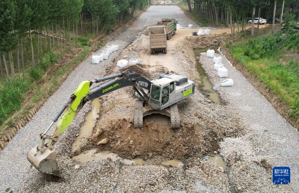 6月20日,工人在河北省盧龍縣木井鎮境內的龍鳳河水生態治理工程工地操作機械設備施工(無人機照片)。