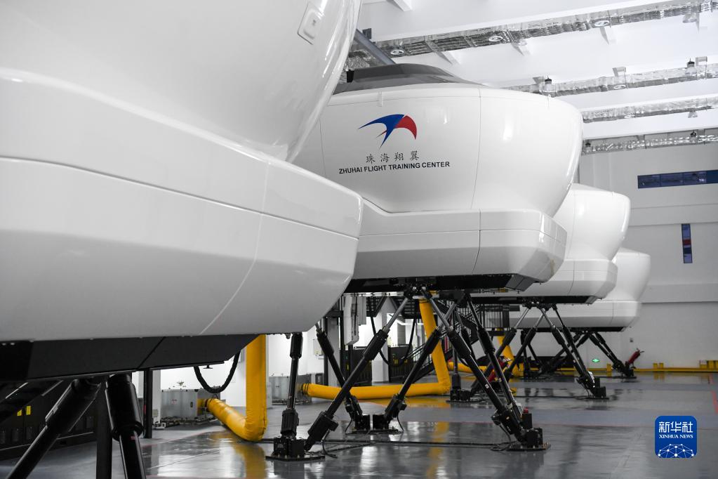 在廣東珠海翔翼飛行訓練中心,多臺飛行模擬機正在開展訓練(6月13日攝)。