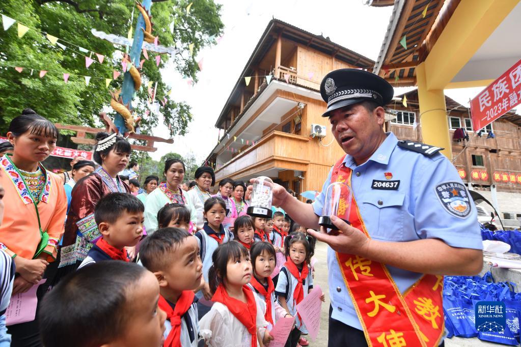 6月20日,在廣西融水苗族自治縣桿洞鄉烏英苗寨,民警介紹禁毒知識。