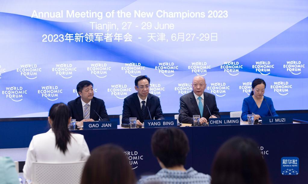 6月20日,國家發展和改革委員會國際司副司長高?。ㄗ笠唬?、天津市副市長楊兵(左二)、世界經濟論壇大中華區主席陳黎明(右二)出席新聞發布會。