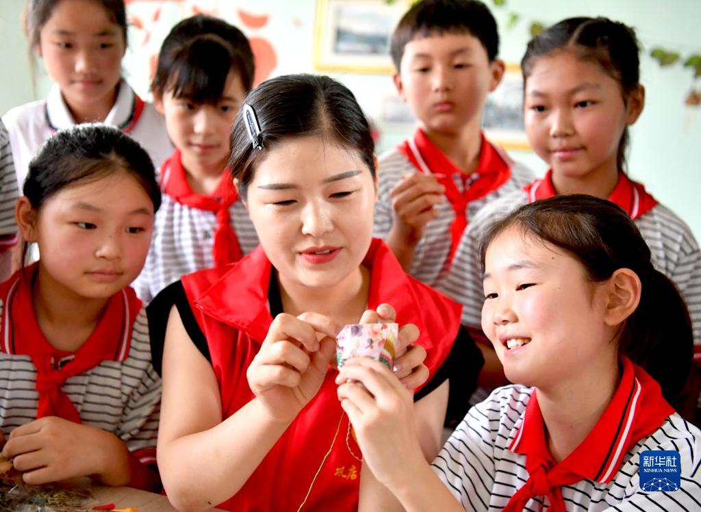 6月20日,在安徽省亳州市利辛縣鞏店鎮鄉村少年宮,志愿者在教孩子們學做香囊。