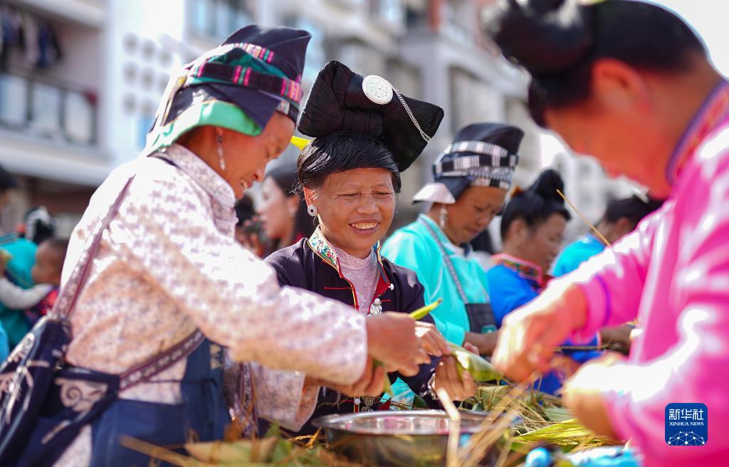 6月20日,在貴州省黔東南苗族侗族自治州丹寨縣金泉街道搬遷群眾安置社區,人們參加包粽子比賽。