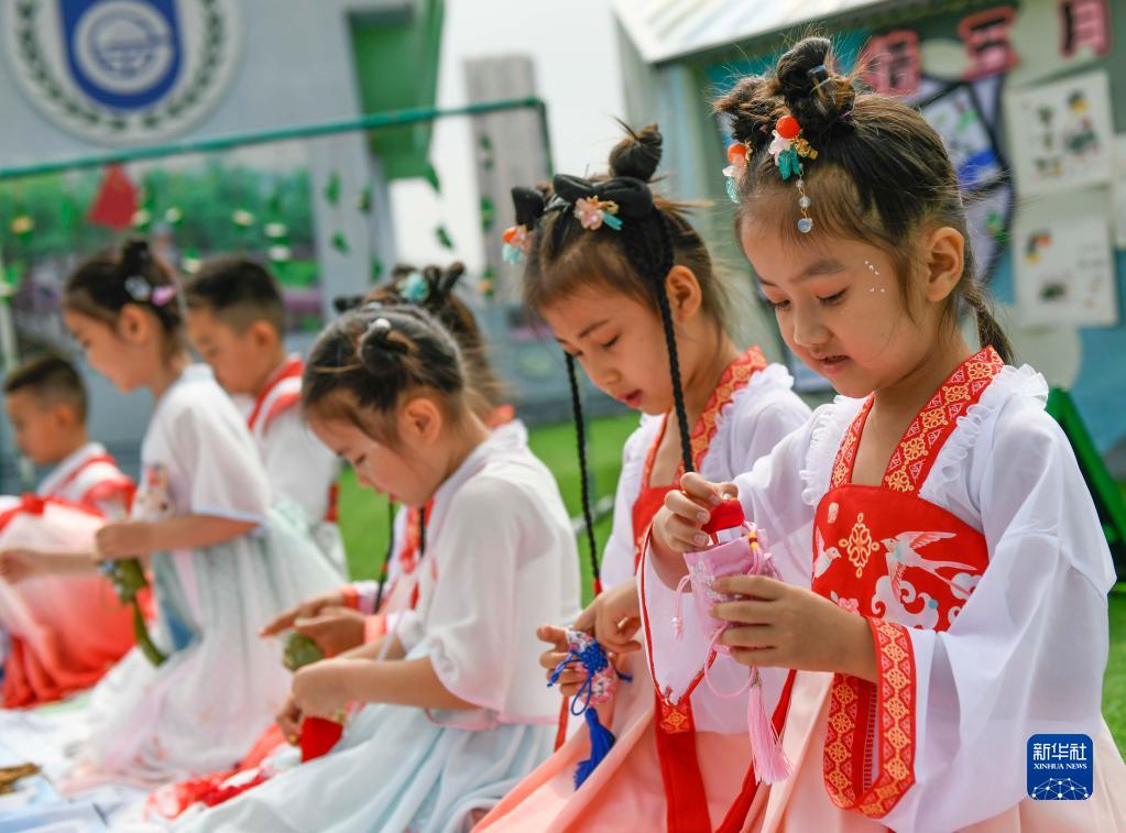 6月20日,河北省遷西縣第一幼兒園的孩子們在做香囊。