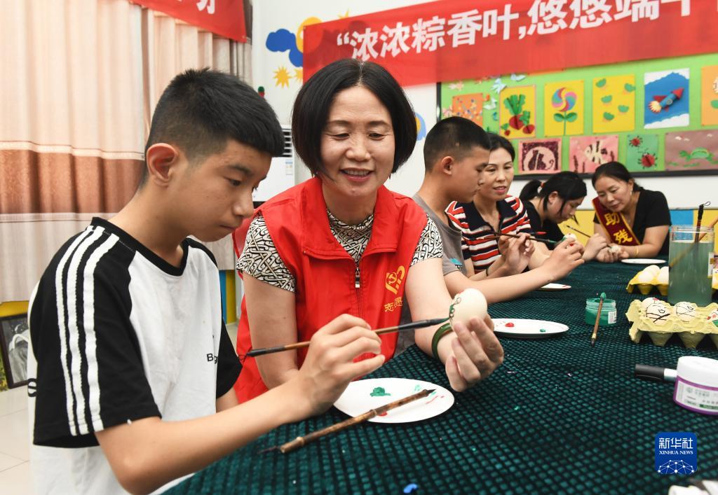 6月20日,在河北省石家莊新樂市特殊教育學校,志愿者和學生一起畫彩蛋。
