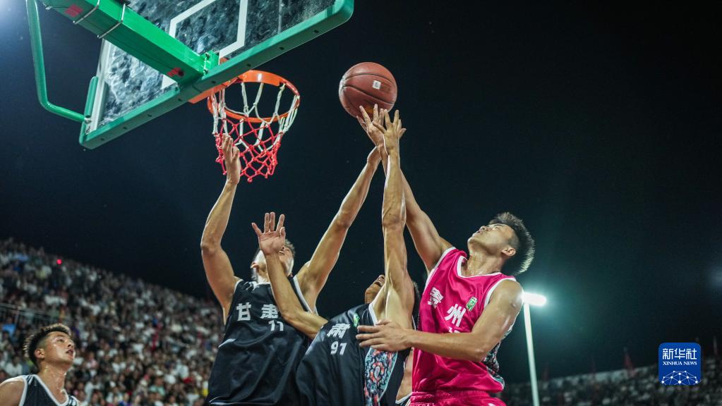 6月20日,貴州黔東南州代表隊球員(右一)在同甘肅臨夏州代表隊球員爭搶籃板。