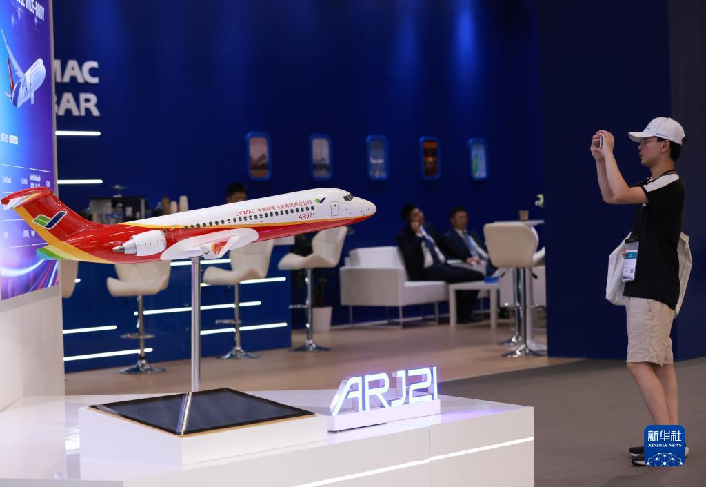 6月20日,一名觀眾在法國巴黎近郊布爾歇機場舉行的第54屆巴黎航展上參觀中國商飛展臺。