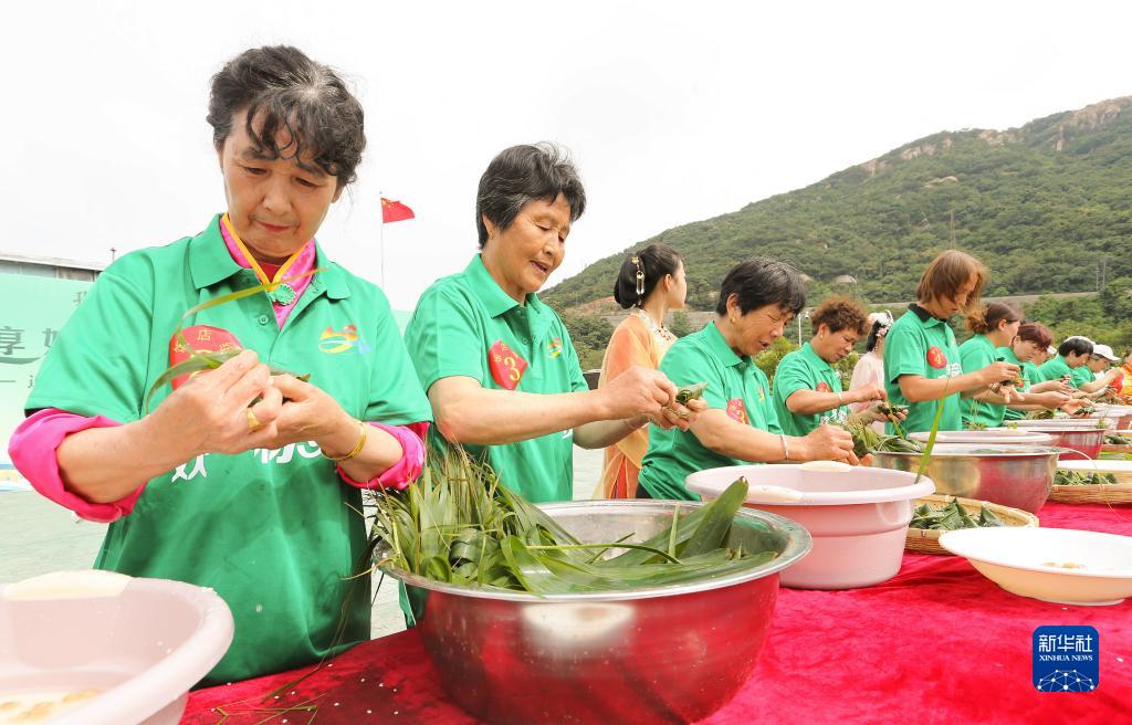 6月18日,在江蘇連云港市連云區高公島凰窩風景區,人們在端午民俗文化活動上參加包粽子比賽。