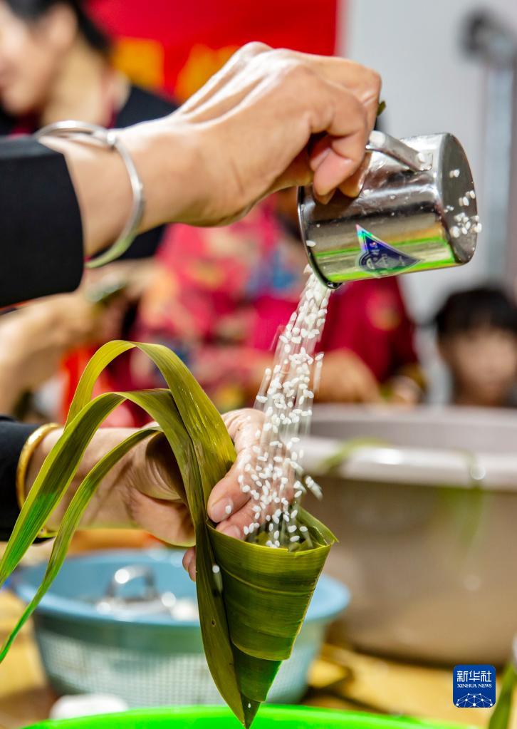 6月18日,江蘇省海安經濟技術開發區七星湖社區居民在包粽子。
