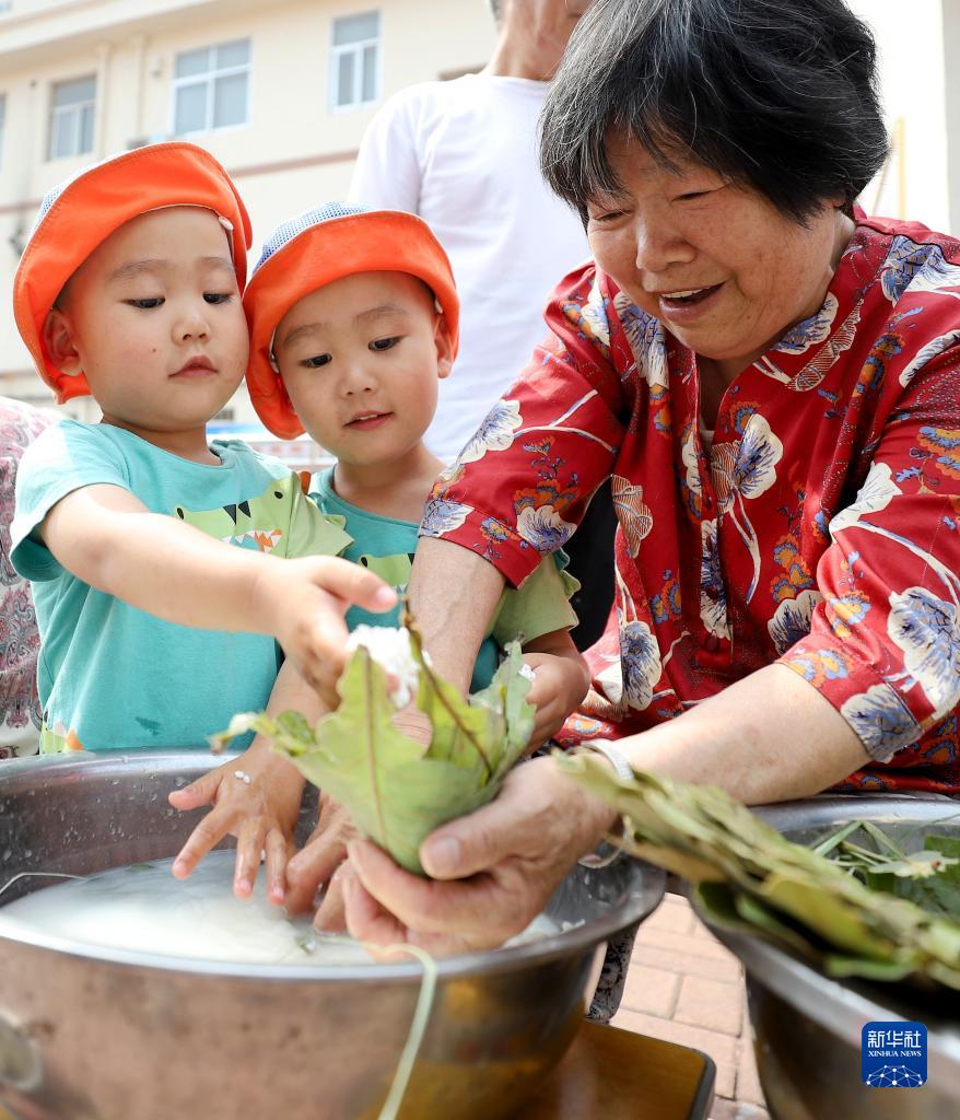 6月16日,在山東省青島西海岸新區隱珠街道黃土莊社區新時代文明實踐站,小朋友學習包粽子。