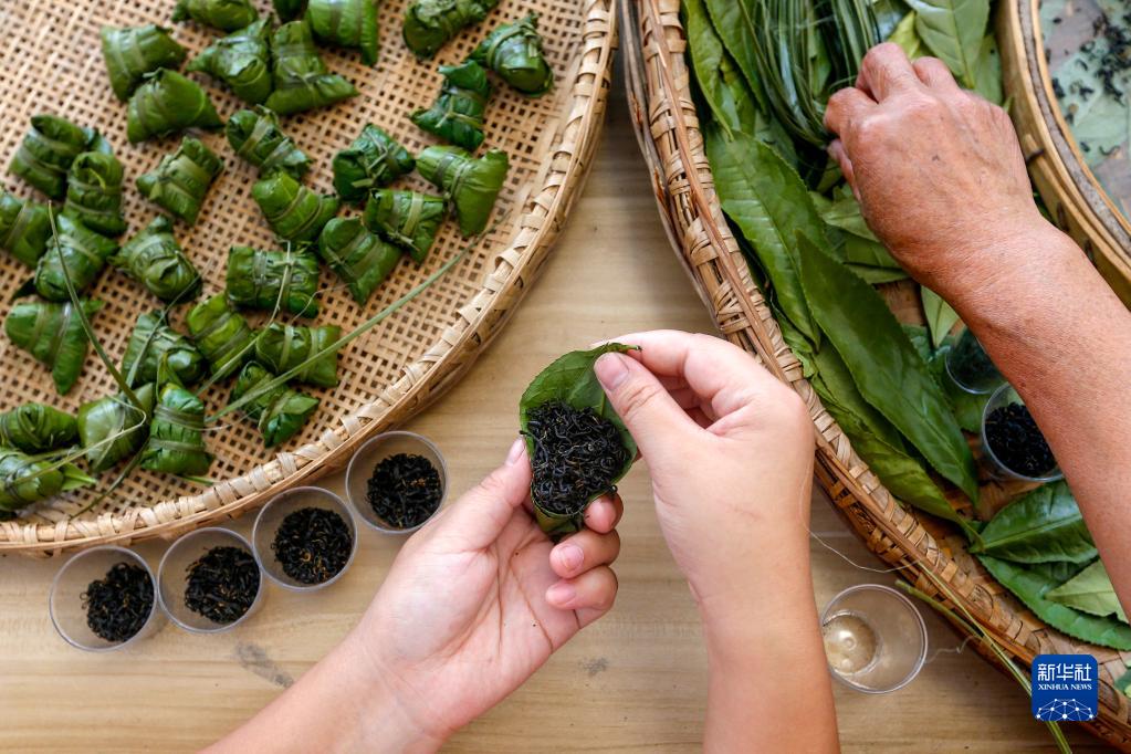 6月14日,在安徽省黃山市祁門縣平里鎮平里村,茶工把祁門紅茶作為“餡料”,用傳統包粽子的手法制作“粽茶”。