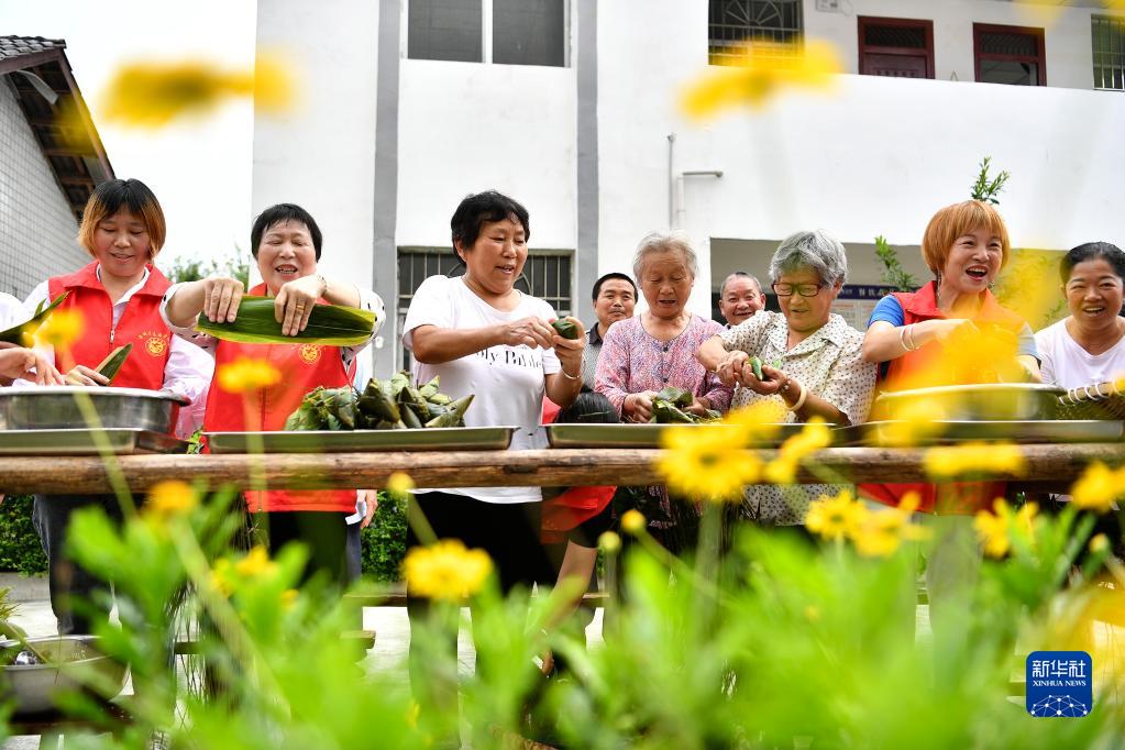 6月20日,四川省廣安市前鋒區志愿者在觀閣鎮敬老院與老人們一起包粽子迎端午。
