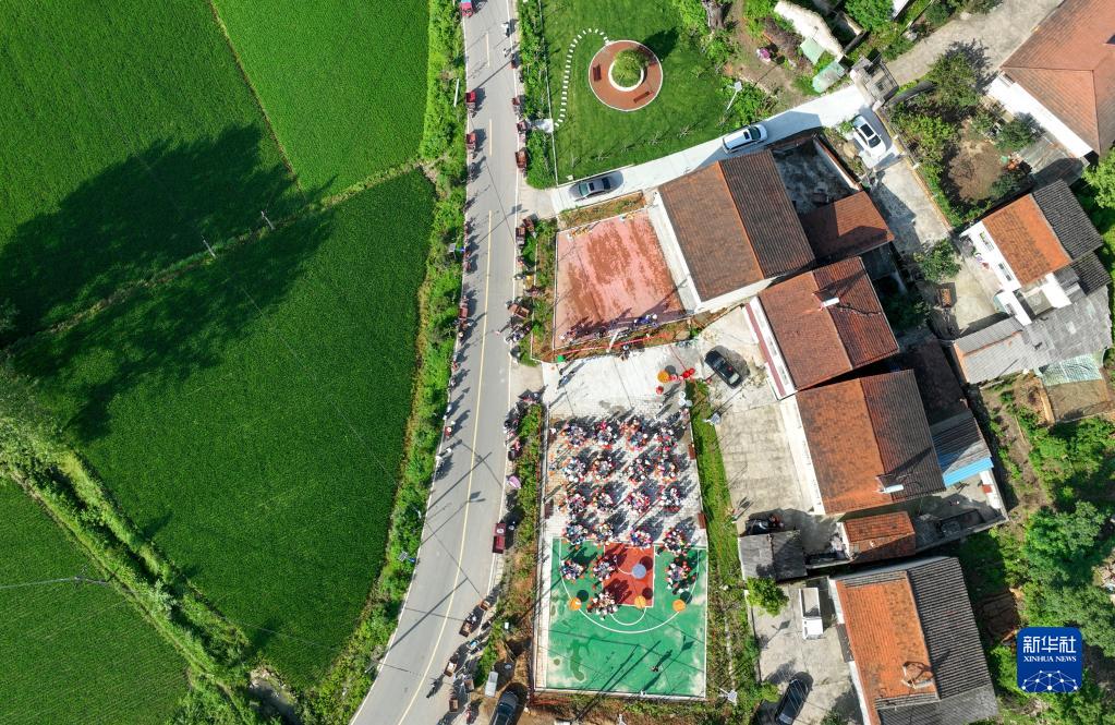 6月20日,湖北省襄陽市襄城區臥龍鎮鄢洲村村民在村廣場上一起包粽子、迎端午(無人機照片)。