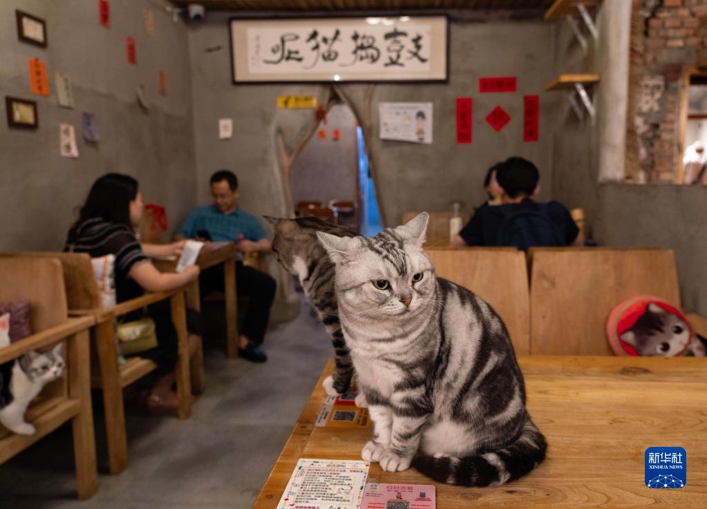 貓咪“小小美”(前)最喜歡在這張桌子上睡覺,這張桌子的桌號就叫“小小美桌”(6月19日攝)。