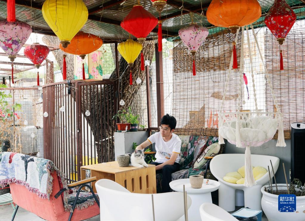 顧客與貓咪“通寶”互動(6月10日攝)。