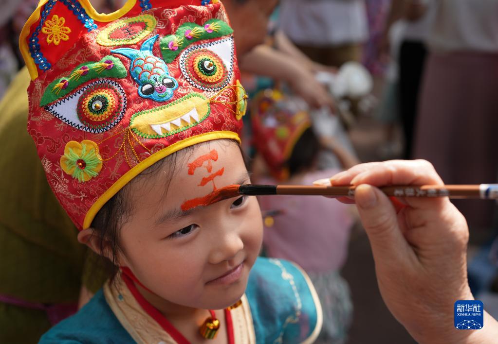 6月21日,一名老人在參加活動的兒童額頭上寫“王”字。