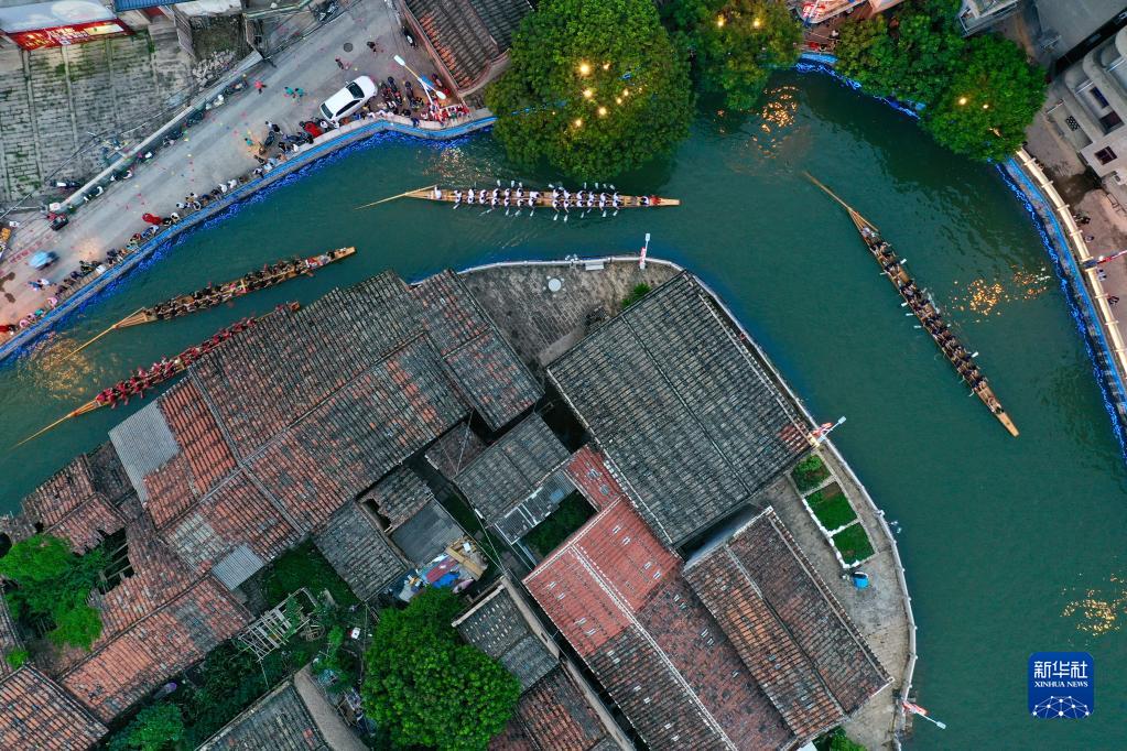 端午來臨,福建省福州市長樂區三溪村獨有的龍舟夜渡迎端午活動如約而至。夜幕降臨,華燈初上,隨著鼓聲響起,數十條龍舟陸續出現在古村的小溪中,清澈的水面上船槳翻飛、龍舟飛馳,夾岸觀眾人頭攢動,加油吶喊不絕于耳,一派熱鬧景象。夜賽龍舟習俗在三溪村已經沿襲600多年,每年端午節前后,村里的男女老少都會相聚一起夜競龍舟,借此祈盼風調雨順、平安健康。