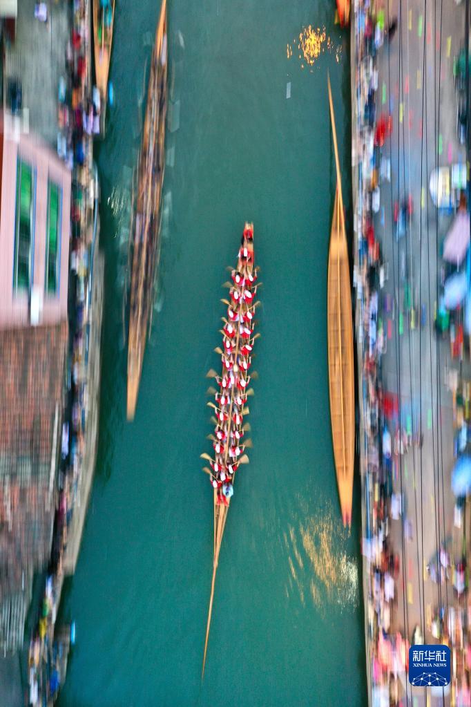 福州市長樂區三溪村,龍舟在穿村而過的小溪中競渡迎端午(6月18日攝,無人機照片)。