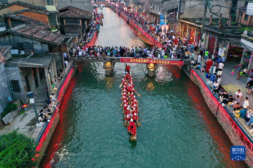 福州市長樂區三溪村,龍舟在穿村而過的小溪中競渡迎端午(6月18日攝,無人機照片)。