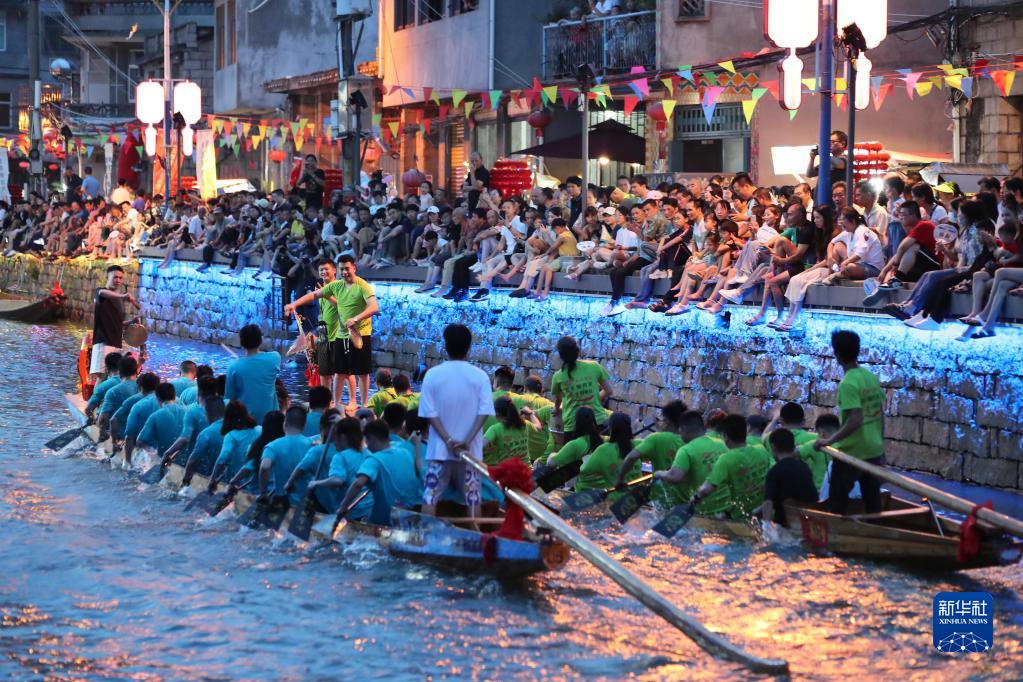 端午來臨,福建省福州市長樂區三溪村獨有的龍舟夜渡迎端午活動如約而至。夜幕降臨,華燈初上,隨著鼓聲響起,數十條龍舟陸續出現在古村的小溪中,清澈的水面上船槳翻飛、龍舟飛馳,夾岸觀眾人頭攢動,加油吶喊不絕于耳,一派熱鬧景象。夜賽龍舟習俗在三溪村已經沿襲600多年,每年端午節前后,村里的男女老少都會相聚一起夜競龍舟,借此祈盼風調雨順、平安健康。