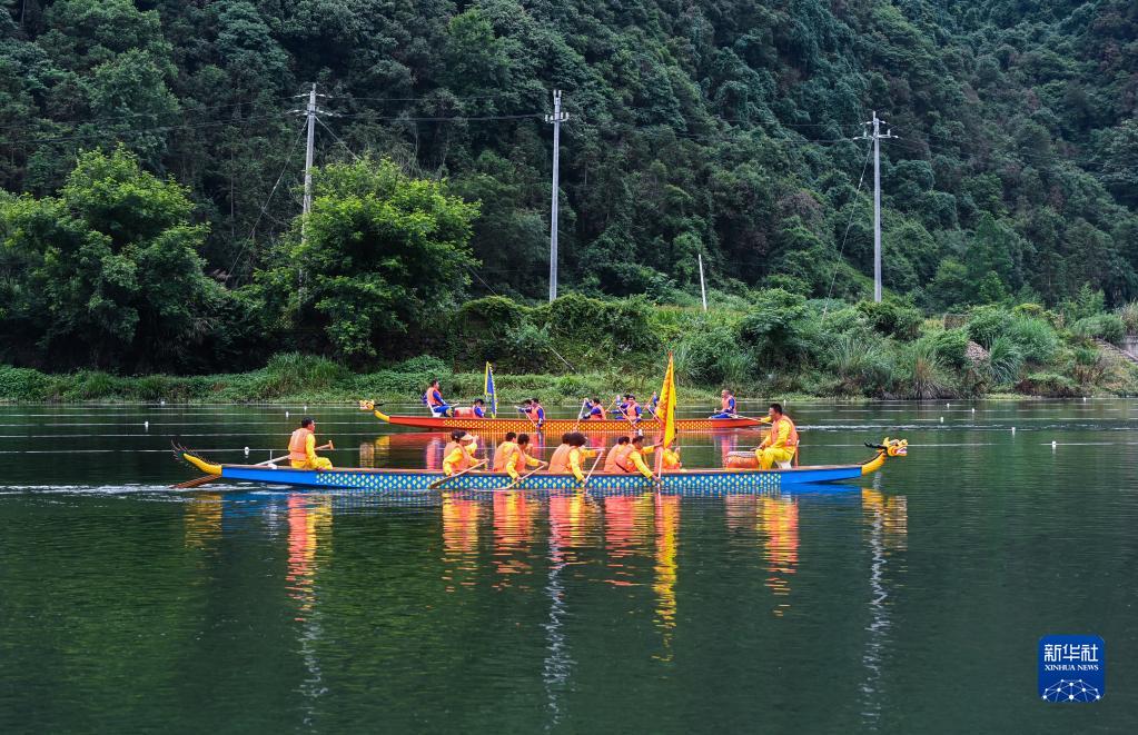 6月21日,在湖源鄉窈口村的回龍湖,村民們在參加劃龍舟比賽。