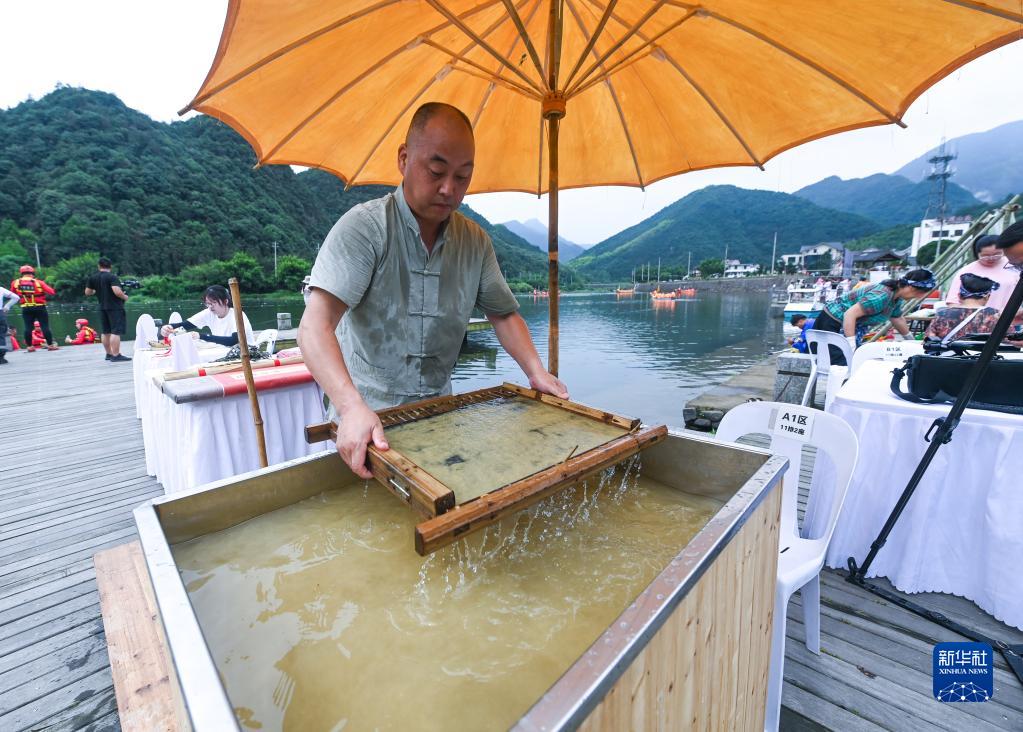 6月21日,在端午文化活動現場,工作人員在展示傳統元書紙的制作技藝。