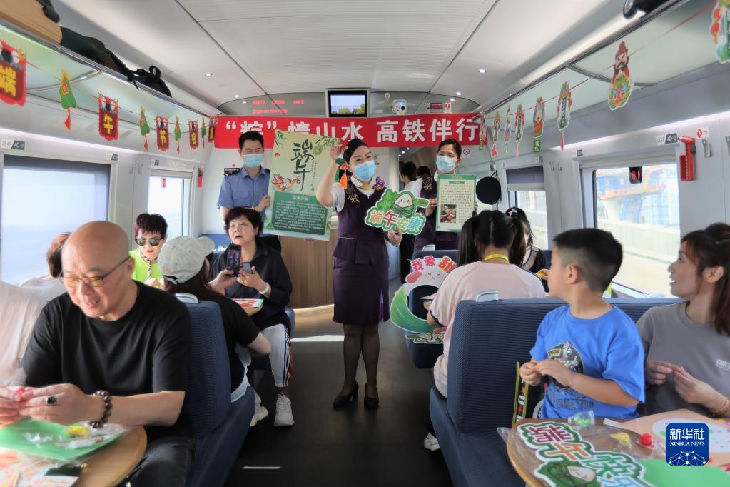 6月21日,上??瓦\段乘務員為旅客介紹端午民俗。