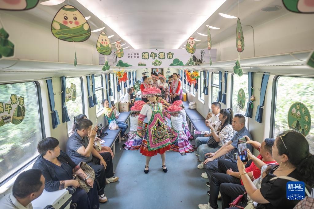 在“集市車廂”里,沿線村民將自家種的粽葉、艾草、菖蒲、糯米、蔬菜等農產品整齊擺放,供乘車旅客選擇購買。逛完“集市”,在“民俗體驗”車廂,旅客還可欣賞民族特色舞蹈、古箏彈奏、吉他彈唱等節目,親手制作粽子及艾草香包,體驗傳統文化民俗。