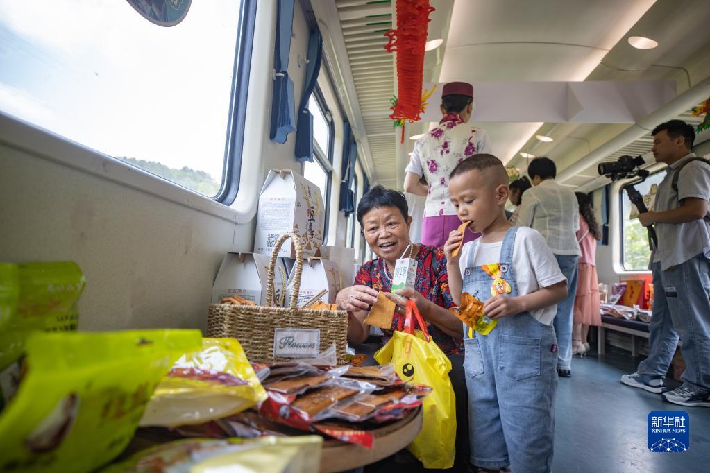 在“集市車廂”里,沿線村民將自家種的粽葉、艾草、菖蒲、糯米、蔬菜等農產品整齊擺放,供乘車旅客選擇購買。逛完“集市”,在“民俗體驗”車廂,旅客還可欣賞民族特色舞蹈、古箏彈奏、吉他彈唱等節目,親手制作粽子及艾草香包,體驗傳統文化民俗。