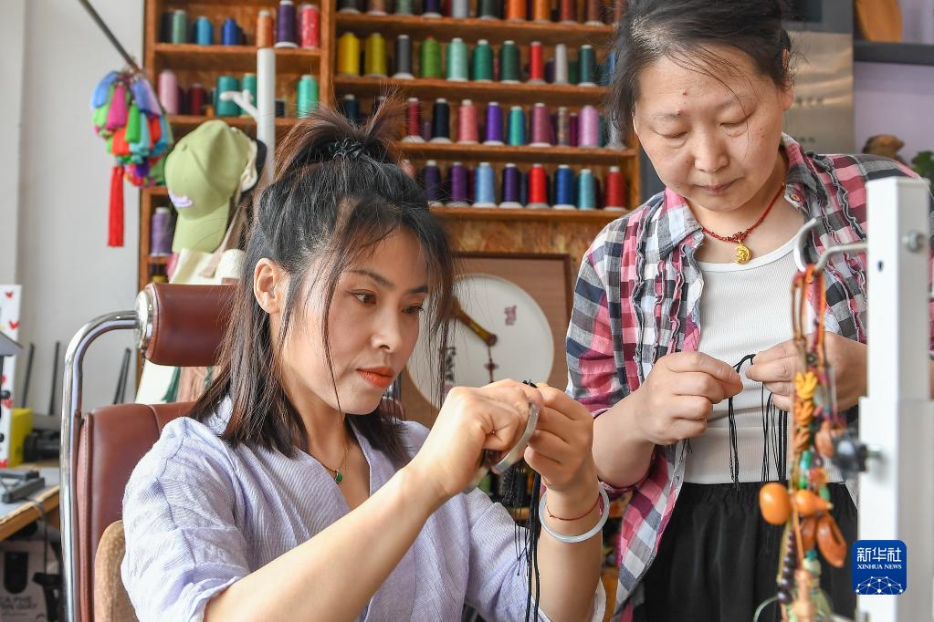6月20日,在吉林省長春市,徐曉雪(左)與團隊成員編繩結工藝品。