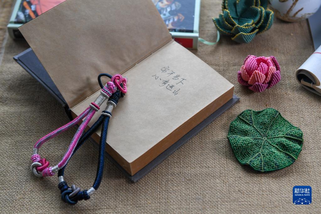 在位于吉林省長春市的徐曉雪工作室內展示的繩結工藝品(6月20日攝)。