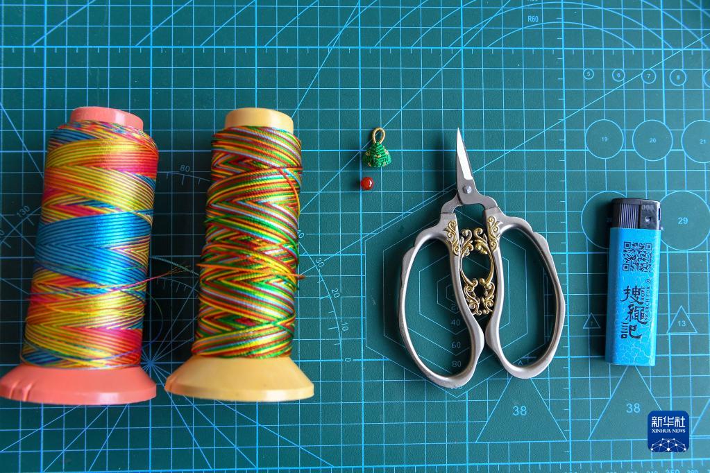 在位于吉林省長春市的徐曉雪工作室內拍攝的制作繩結工藝品的材料和工具(6月20日攝)。