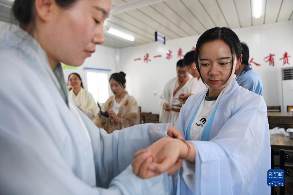 6月21日,中建三局的一線建設者在項目工地上佩戴自己編織的端午彩繩。