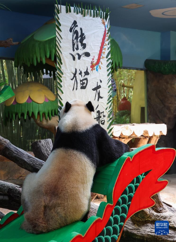 當日,廣州長隆野生動物世界熊貓館的10余只大熊貓迎來一個特別的端午節,它們與游客一起渡龍船、吃粽子,“體驗”一把端午文化的氛圍。