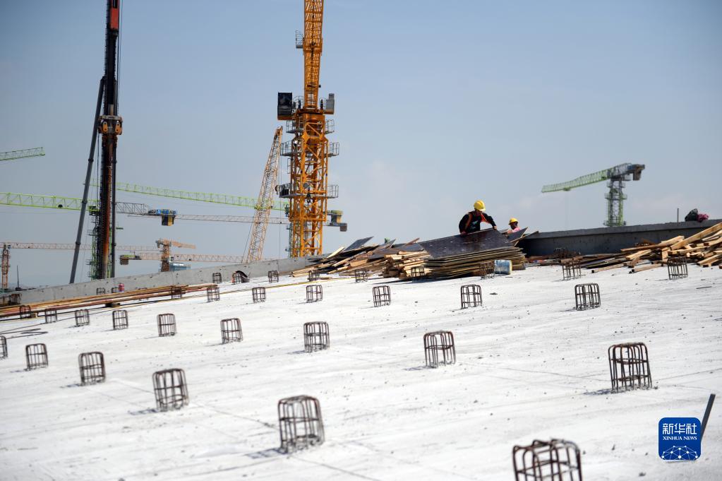 6月21日,中建三局工人在廈門翔安機場指廊工程項目建設工地施工。該項目已進入封頂沖刺階段。