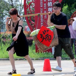 當日,浙江省湖州市長興縣和平鎮長崗村開展“迎端午”農民趣味運動會,進行瓶口插秧、挑擔子、獨輪車運蔬菜等項目,以此方式迎接端午節。